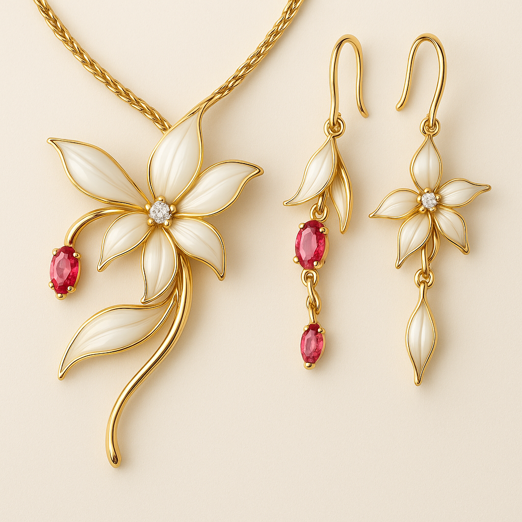 گل آجمانند نمادِ ظرافت ابدی، و یاقوتها چکیدهای از انرژی و زندگی هستند.